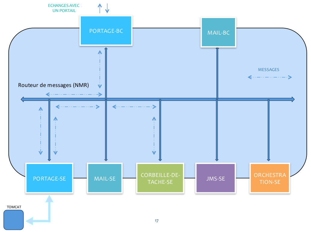 Pour ce projet, le client disposait d'une infrastructure existante tournant sur Oracle WebLogic. Le désir de mettre en place une couche de médiation ainsi que l'expiration de la licence on décidé celui-ci à mettre en place un ESB (Apache ServiceMix). L'une des contraintes du client était la nécessité de mise en place de manière totalement transparente du système, de manière à ne pas avoir besoin de retoucher le portail. Une fois le portage effectué, le bus de service est mis en place. Il est alors très simple d'ajouter ou de supprimer des composants.