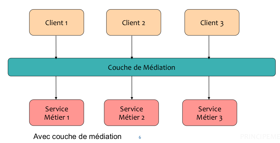 La couche de médiation est un intermédiaire entre consommateurs et fournisseurs de services. Elle permet de mettre en place un découplage :
