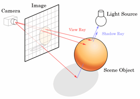 Pour chaque pixel de l'image générée, est effectué un lancer un rayon depuis le point de vue (la caméra) dans la scène 3D. Le premier point d'impact du rayon sur un objet définit l'objet concerné par le pixel correspondant. Des rayons sont ensuite lancés depuis le point d'impact en direction de chaque source de lumière pour déterminer sa luminosité (est-il éclairé ou à l'ombre d'autres objets ?).
