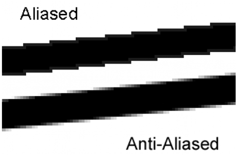 - Anti-aliasing : L'affichage des images se fait sous la forme de pixel (carrée ou rectangulaire), qui offrent le désavantage de produire de la pixellisation. À une certaine résolution, le bord des formes ayant un angle particulier prend la forme d’escalier ou crénelage. Pour supprimer cet effet visuel disgracieux, on utilise l’anticrénelage (ou anti-aliasing).