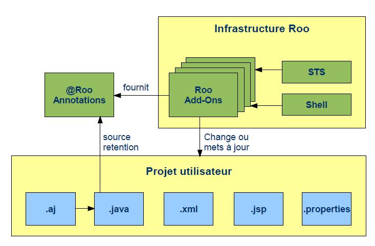 Ci-dessous se trouve un schéma montrant l'implémentation de Roo. Roo est donc basé sur des Add-ons. Ces dernier vont mettre à jour tous les fichiers de votre projet, grâce notamment à des annotations