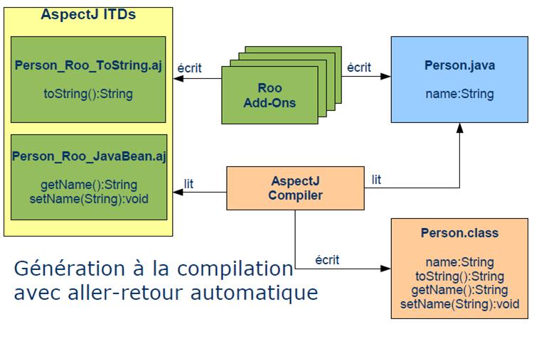 Les tags du type @RooXXX ne persistent pas dans le bytecode et permettent à Roo d’effectuer le lien avec les aspects au moment de la compilation. Le système mis en place se base sur la notion de métadonnées (dont les annotations font partie), ce qui le rend suffisamment souple pour supporter un mécanisme d’add-ons. Chaque type de code (getter et setter, méthodes de persistance, méthodes de contrôleur) est généré par un add-on différent, ce qui rend possible l’apparition de générateurs pour d’autres technologies telles que JSF.