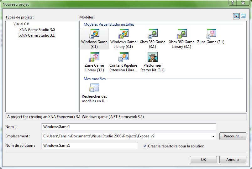 Notez que Windows Phone n'apparait pas sur les modèles de projet proposés. En effet, le développement de jeux XNA sur cette plateforme n'est disponible qu'à partir de la version 4.0 de XNA.