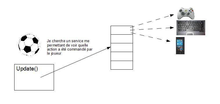 Au moment de l'étape " update ", la classe Ballon cherchera un service qui pourra lui dire quelle action a été commandé par le joueur. Pour cela, ce service doit respecter un certain contrat. Ainsi, un service correspondant au contrat fourni par le joueur sera extrait. Ainsi le fonctionnement du ballon est complètement indépendant du type de contrôle utilisé. Le développeur pourra, s'il le souhaite, changer de contrôles ou de plateformes sans qu'il n'y ait d'impact sur la classe Ballon.