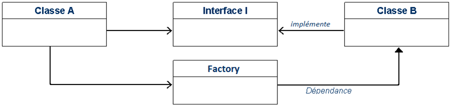 Afin d'avoir du code java propre, la comunauté java à instauré des principes de programmations. Ces principes sont appelés des Design Pattern. Parmis ces design pattern on peut trouver le pattern factory. Ce pattern permet d'avoir une classe factory qui va gérer les dépendances. Cette factory possède des méthodes qui vont instancier la dépendance (ici B) et la retourner. Chaque fois qu'une dépendance devra être résolue (besoin d'un objet de type I) , la classe appelante utilisera la factory.