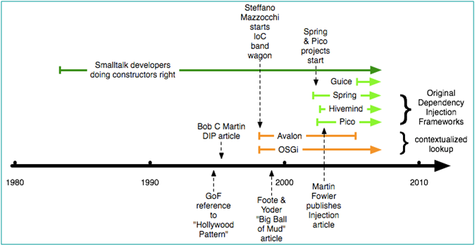 Les frameworks PicoContainer et Excalibur (sous son ancien nom Avalon) ont été les premiers à apparaitre comme frameworks d'injection de dépendance. Guice et Spring étants très récents