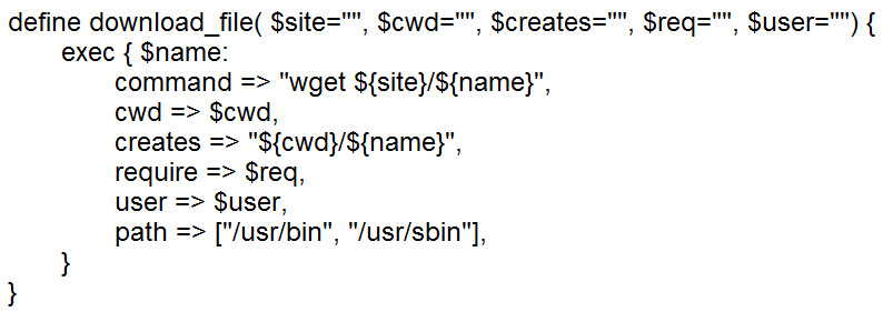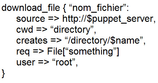 On définit la commande et ses paramètres avec "Define" et on place les commandes à effectuer (Puppet types) entre les accolades.
