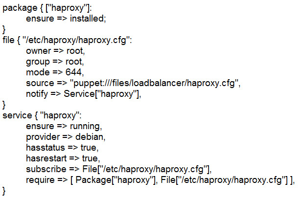 En second, avec le type File, le fichier de configuration est copié depuis le serveur sur le client (paramètre source) et placé au bon endroit. Chaque modification de ce dernier notifiera le service Haproxy (pour qu'il soit redémarré).
