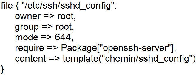 content => template(“chemin/sshd_config") spécifie le chemin de la template.