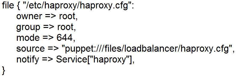 source => "puppet:///files/loadbalancer/haproxy.cfg", spécifie la copie simple du fichier du serveur vers le client