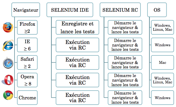 Selenium remote control va permettre de porter les tests vers de nouveaux navigateurs. Voici le tableaux récapitulatifs des compatibilités navigateur<=>système d'exploitation.