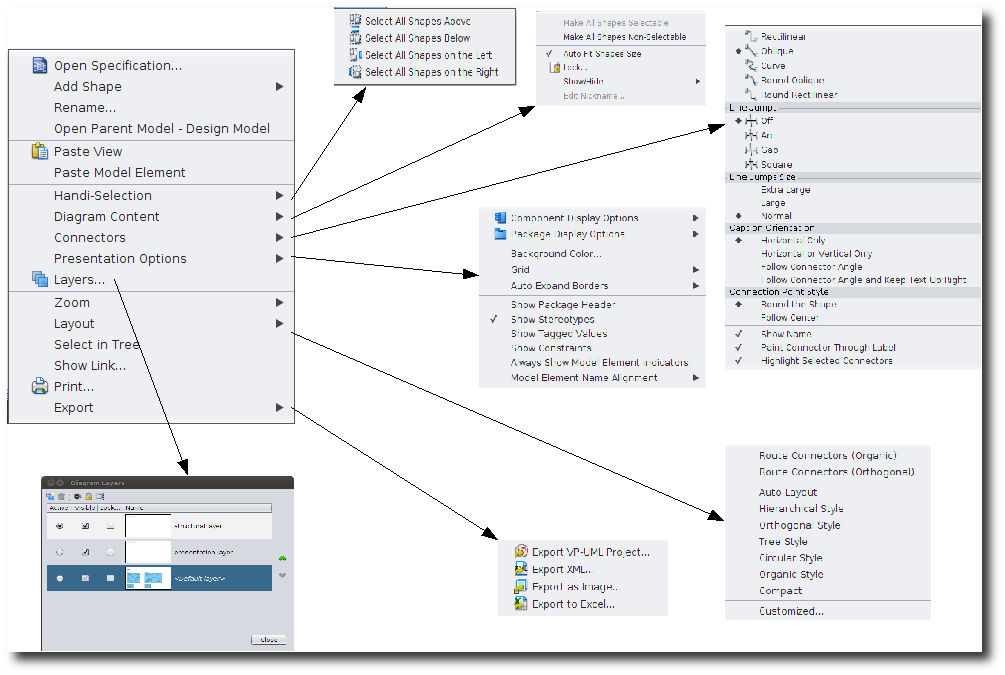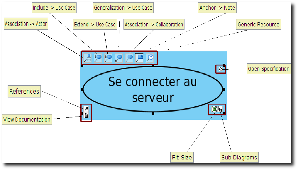 Chaque fonctionnalité de Visual Paradigm for UML est accessible de plusieurs façon. En générale, celle-ci est accessible dans les menu déroulant se situant classiquement en haut de la fenêtre. On peut également y accéder par le clic droit qui a l'avantage d'être contextuel et de ne présenter que les fonctionnalités en rapport avec l'objet cliqué. Enfin on pourra se servir de l'interface qui apparait lorsque l'on sélectionne un élément du diagramme qui permet également d'accéder à ces fonctionnalités.