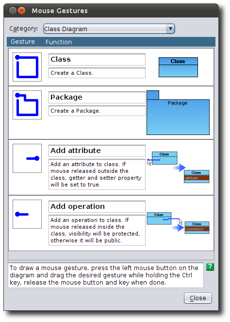 Toujours dans cette optique de facilité l'utilisation du logiciel et d'améliorer l'expérience utilisateur, il existe la possibilité de créer des objets graphique en réalisant des gestes avec la sourie, permettant ainsi de se passer totalement de l'interface graphique puisque l'on se servira d'un geste de la sourie pour créer un élément ou une relation. Le but ici est de réserver l'utilisation des menus à de rares fonctionnalités qui n'on pas de rapport direct avec la modélisation. On restera ainsi concentré sur la modélisation proprement dite sans perdre de temps en navigation dans les menus à la recherche d'une fonctionnalité.