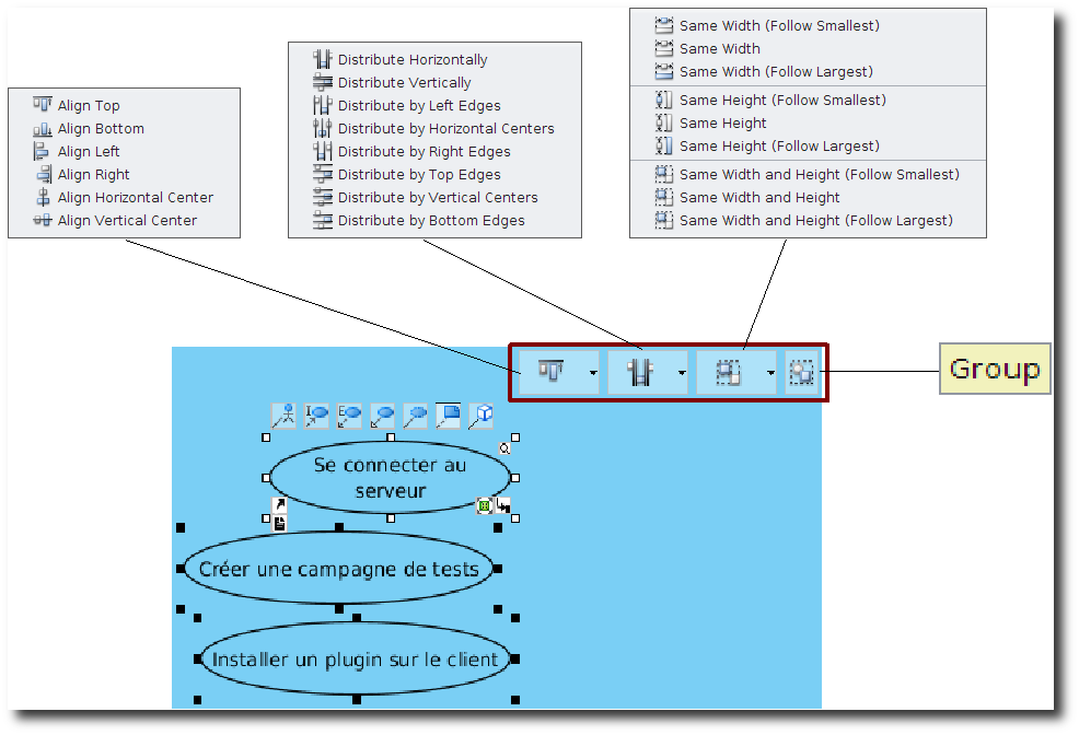 L'intérêt de ce type d'interface est de permettre à l'utilisateur de rester concentrer sur ce qu'il est en train de modéliser en lui donnant accès à tout un tas de fonctionnalités directement en cliquant sur un éléments d'un diagramme. Une petite barre de menu apparait alors, permettant d'accéder aux fonctionnalités relatives à l'élément cliqué. De la même façon, si l'on sélectionne plusieurs éléments, on va avoir accès à des fonctionnalité de groupement, d'alignement et de répartition.
