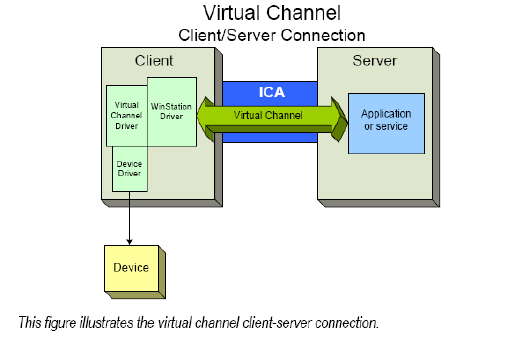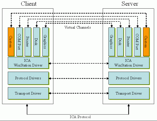 Tous les canaux virtuels clients passent par le pilote WinStation, Wdica.sys côté serveur et communiquent avec le côté client via le pilote WinStation correspondant, compilé dans wfica32.exe.