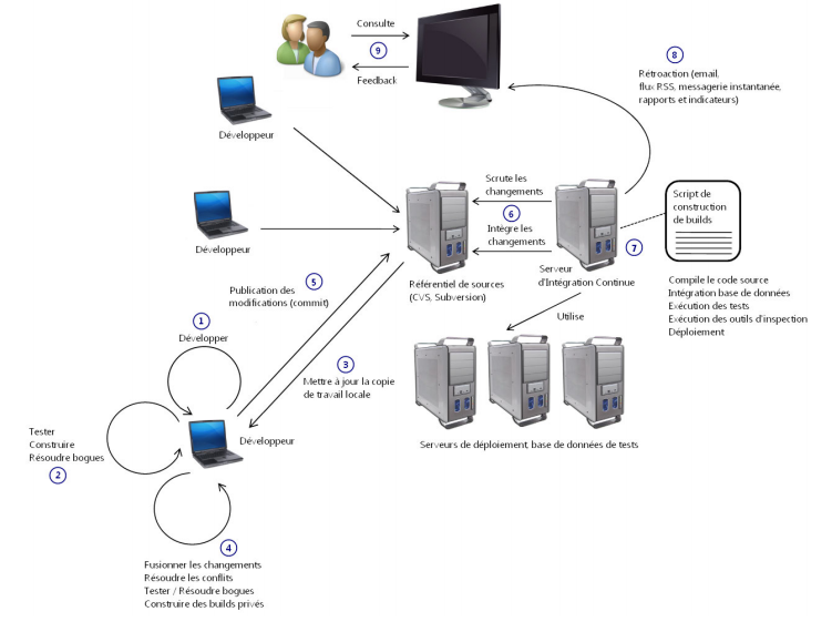 - Le serveur d'intégration continue qui scrute le gestionnaire de sources détecte un changement.
