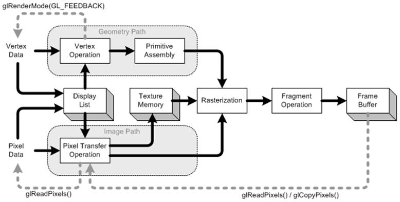 - Pixel transfer operation: Après que tous les pixels soient chargés, ils subissent des opérations de transformation d'images. Ces données seront stockées dans la Texture memory, avant d'être utilisé avec les formes géométriques (comme une texture).