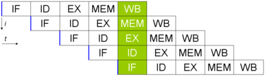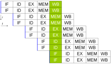 - MEM (Memory), dénote un transfert depuis un registre vers la mémoire dans le cas d'une instruction du type STORE (accès en écriture) et de la mémoire vers un registre dans le cas d'un LOAD (accès en lecture).