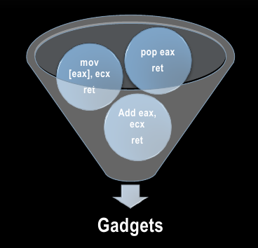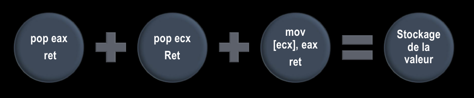 Vu que toutes les instructions exécutées appartiennent au programme original il n'y a pas besoin de faire d'injection de code. Un ensemble d'instructions combinées forme un gadget, ils permettent de faire des actions de haut niveau comme écrire dans la mémoire, faire des calcules (ADD/SUB/AND/XOR/OR) sur des valeurs à une adresse mémoire et aussi appeler une fonction sur des bibliothèques partagées.