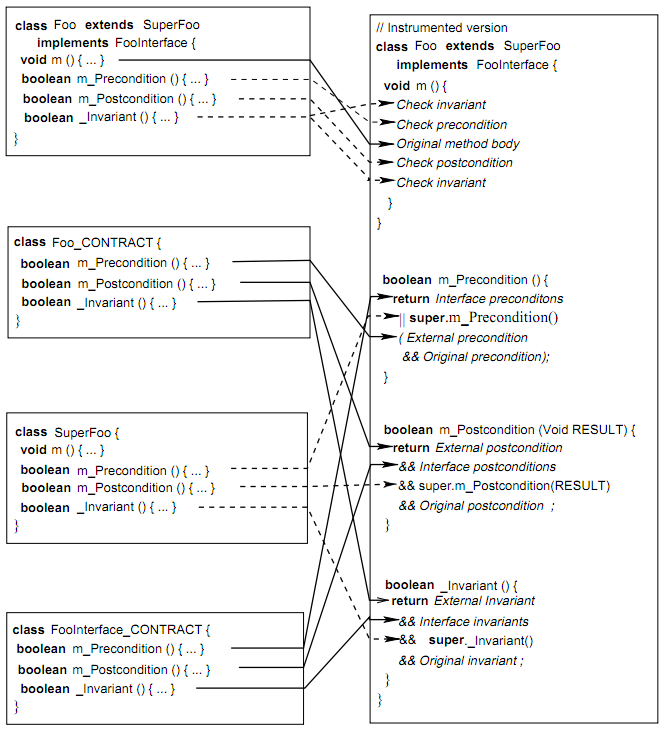 class A { public void m() { ... } protected boolean m_Postcondition(Void RESULT) { ... } } class B extends A implements C { @Override public void m() { ... } protected boolean m_Postcondition(Void RESULT) { ... } } class B_CONTRACT { protected boolean m_Postcondition(Void RESULT) { ... } } interface C { void m(); } class C_CONTRACT { protected boolean m_Postcondition(Void RESULT) { ... } }