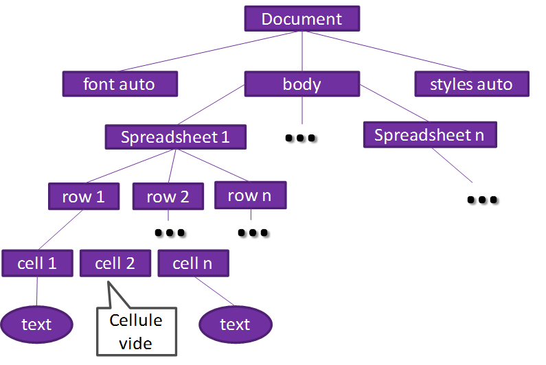 Comme sur le schéma, on voit l'architecture des données: Document, body, Spreadsheets(onglet excel), lignes puis cellules. On voit que la balise cell vide représente une cellule vide dans le fichier (voir la balise C1 en vert).