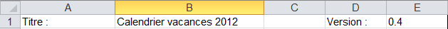 <office:body> <office:spreadsheet> <table:table table:name="Feuille1"> <table:table-row> <table:table-cell office:value-type="string"> <text:p>Titre :</text:p> </table:table-cell> <table:table-cell office:value-type="string"> <text:p>Calendrier vacances 2012</text:p> </table:table-cell> <table:table-cell/> <table:table-cell office:value-type="string"> <text:p>Version :</text:p> </table:table-cell> <table:table-cell office:value-type="string"> <text:p>0.4</text:p> </table:table-cell> </table:table-row> <table:table-row>...</table:table-row> </table:table> </office:spreadsheet> <office:body>