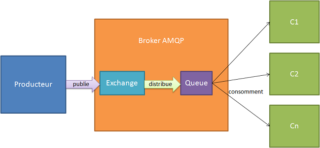 En effet, la queue du broker reçoit tous les messages provenant d'un ou plusieurs producteurs et envoient les messages un à un aux consommateurs qui sont disponibles. Le premier consommateur disponible est celui qui va recevoir le message, car pour rappel, un message ne peut être consommé qu'une seule fois, et par conséquent par un seul consommateur.