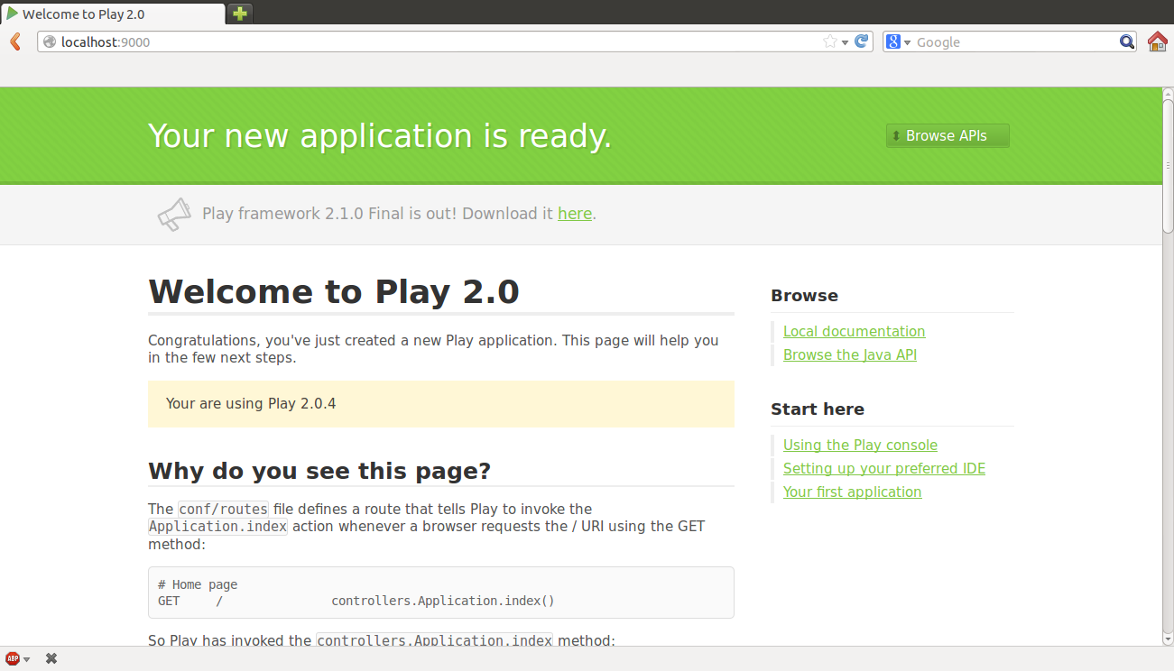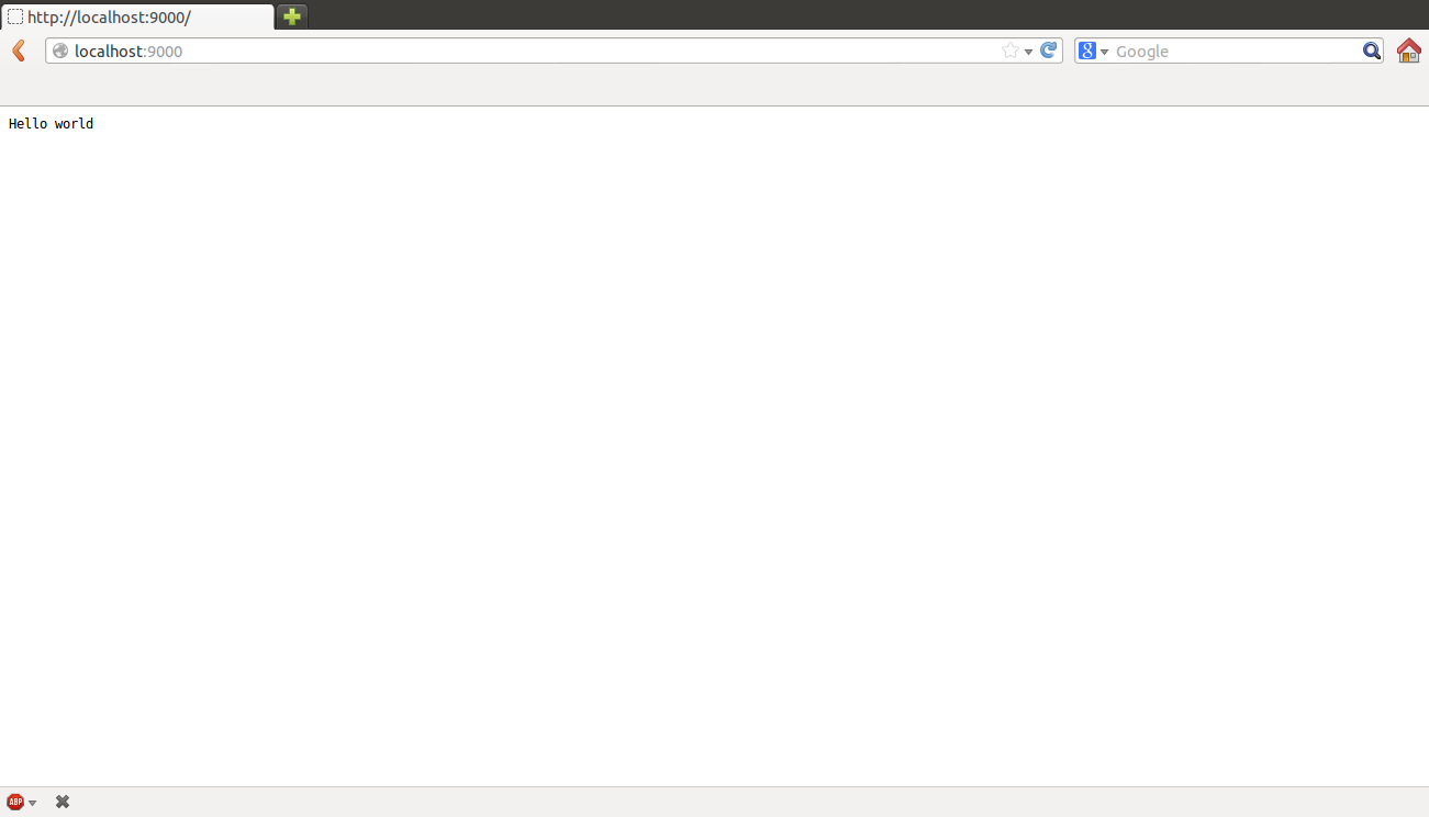 Notre nouvelle application est maintenant lancée et on peut accéder à notre serveur web depuis un navigateur à l'adresse: http://localhost:9000/