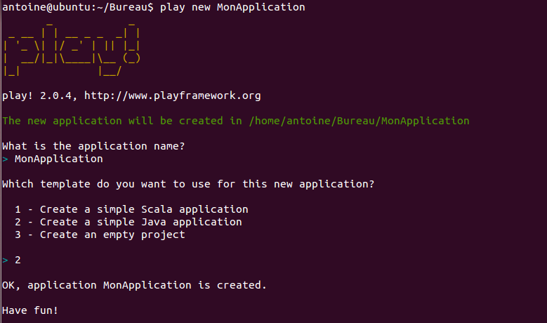 La première étape de ce tutoriel est la création du projet. Pour cela rien de plus simple, il suffit de taper la commande:$ play new MonApplication