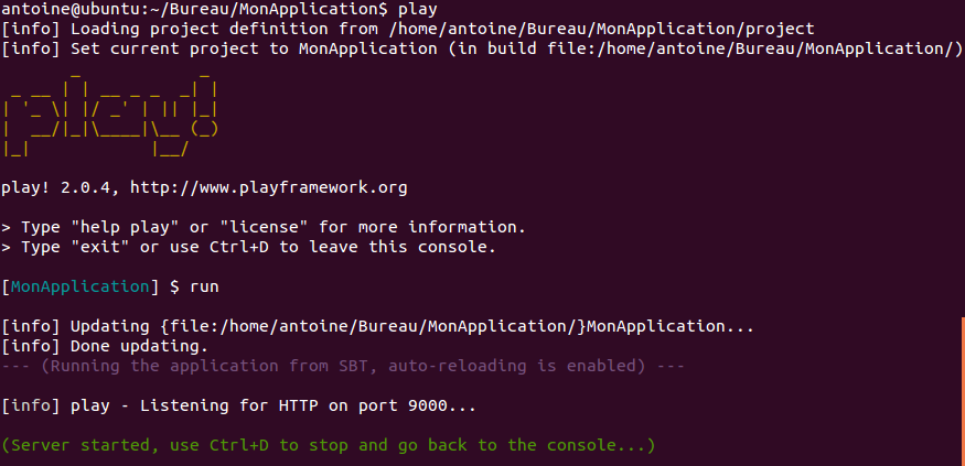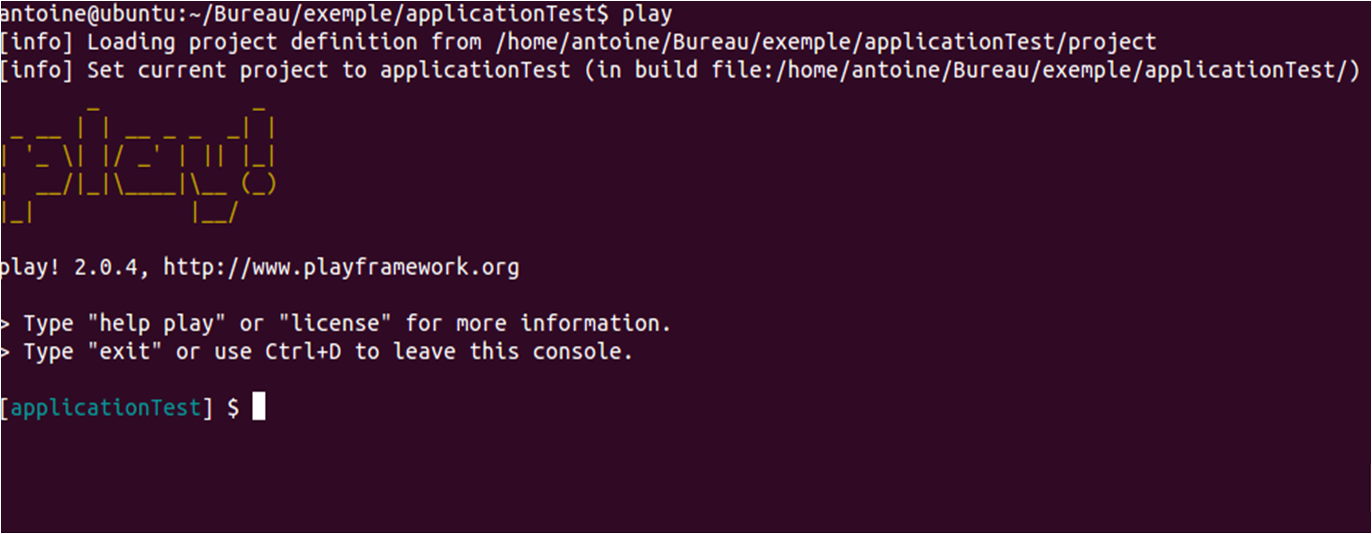 Une fois l'application créée un nouveau dossier au nom de l'application est créé. Il faut maintenant se déplacer dans ce dossier afin de pouvoir utiliser la console Play sur ce projet.