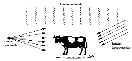 L'éclairement d'un objet par des sources lumineuses est un facteur de "réalisme" très important. Parmi les sources de lumière éventuelles, on distingue la lumière ambiante, caractérisée par une distribution uniforme de l'éclairement, les sources ponctuelles à distance finie de l'objet qui provoquent un clairement radial et les sources à l'infini qui éclairent l'objet avec des rayons lumineux parallèles :