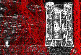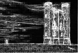 Dans la figure à droite, ci-dessus, plus une zone est dense, plus elle est blanche. Ainsi les zones de densité très faibles sont noires et ne sont pas intéressantes du point de vu du contenu de notre image : elles ne représentent pas de sujet avec un aspect ou des proportions particulières ; on pourrait les écraser ou les étirer sans que cela ne soit perturbant. On remarque donc que les les zones de haute densité sont essentiellement agglomérées au niveau du chateau et du personnage, mais également au niveau de certains motifs que l'on retrouve dans les nuages.