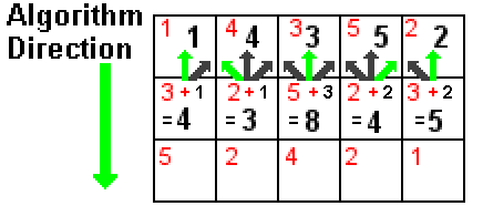 À présent, en partant du bas de l’image, nous pouvons voir apparaître les seams de moindre énergie : ce sont les chemins que nous pouvons parcourir en suivant les flèches vertes depuis les pixels dont la somme cumulative (valeur en noir dans la dernière ligne) est la plus faible. L'illustration suivante nous permet de détecter deux chemins de valeur minimum :