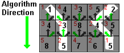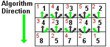 Avec nos images, ce ne sont pas seulement deux, mais bien trois directions qui sont envisageables à chaque ligne (le pixel à la diagonale gauche, celui à la diagonale droite et celui immédiatement en-dessous). De plus, notre espace de travail n’a pas qu’un unique sommet, mais peut-être plusieurs milliers (autant de sommets que la largeur de l’image originale). Ainsi, pour une image de largeur w et de hauteur h, le nombre de chemins possibles est de w*3h : un parcours naïf de toutes ces combinaisons serait de complexité algorithmique exponentielle, donc inutilisable.