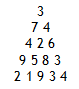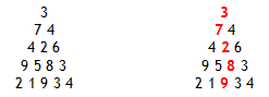 Dans ce triangle, la somme de chemin maximale est 29, on l'obtient en faisant 3 + 7 + 2 + 8 + 9, comme illustré en rouge ci-dessous :