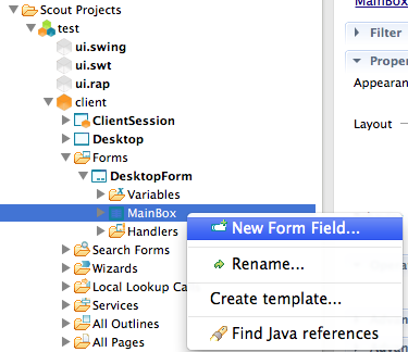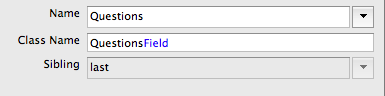 De la même manière, nous allons ajouter un champ TableField qui contiendra la liste des questions. Dans la MainBox du DesktopForm, sélectionner " New Form Field… " avec le menu contextuel. Dans la liste des types de champ, choisir "table field" et cliquer sur " next > ". Donner un nom (name) " Questions ".