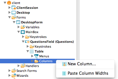 Une fois l'action réalisée, il nous faut ajouter des colonnes à afficher. Pour cela, rien de plus simple, il faut se rendre dans l'élément récemment créé : QuestionField > Table > Columns et choisir " New columns… " dans le menu contextuel. La première colonne sert à stocker l'ID de la question. Sélectionner Integer Column. Donner un nom " Nr ", et un Type Name " QuestionNrColumn ".