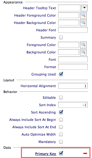 Pour spécifier que l'on souhaite que le numéro de ligne corresponde à l'ID, il faut se rendre dans la vue des propriétés de la colonne récemment créé. Puis on sélectionne dans "Data" l'élément "Primary key"