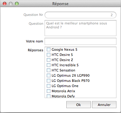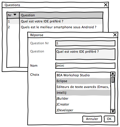 Nous souhaitons réaliser une application de QCM qui ressemblerait au schéma ci dessous. Pour ce faire, nous allons devoir créer un tableau contenant des chaines de caractère et lorsque l'on réalise un double clique sur une question, nous pouvons ouvrir un nouvelle qui nous permettra de répondre à la question.