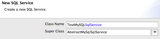 Donner un nom : TestMySQLSqlService et sélectionner la classe parente correspondant à MySQL comme Super Type : AbstractMySQLSqlService.