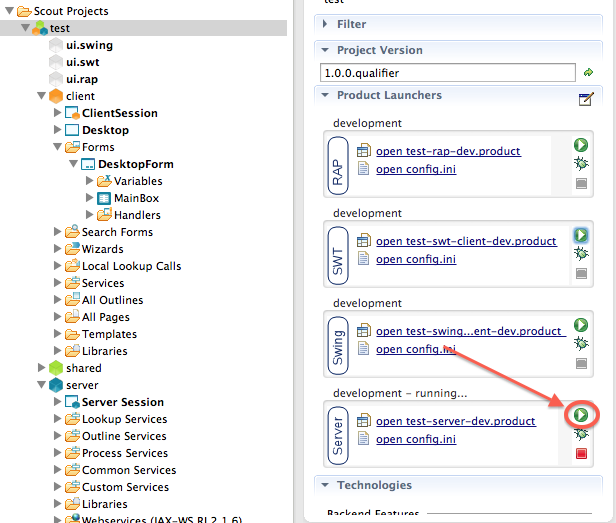 Le déploiement sur un serveur Tomcat en compilant l'application depuis Eclipse est très simple. Sélectionner le serveur "Scout Projects > test > server" et sélectionner dans le menu contextuel "Export as war…".