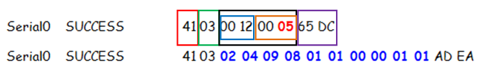 Couleur bleue : code de la demande (2 octets) ==> (00 12)h, soit la demande de lecture du numéro de série du marqueur entrée dans le champ