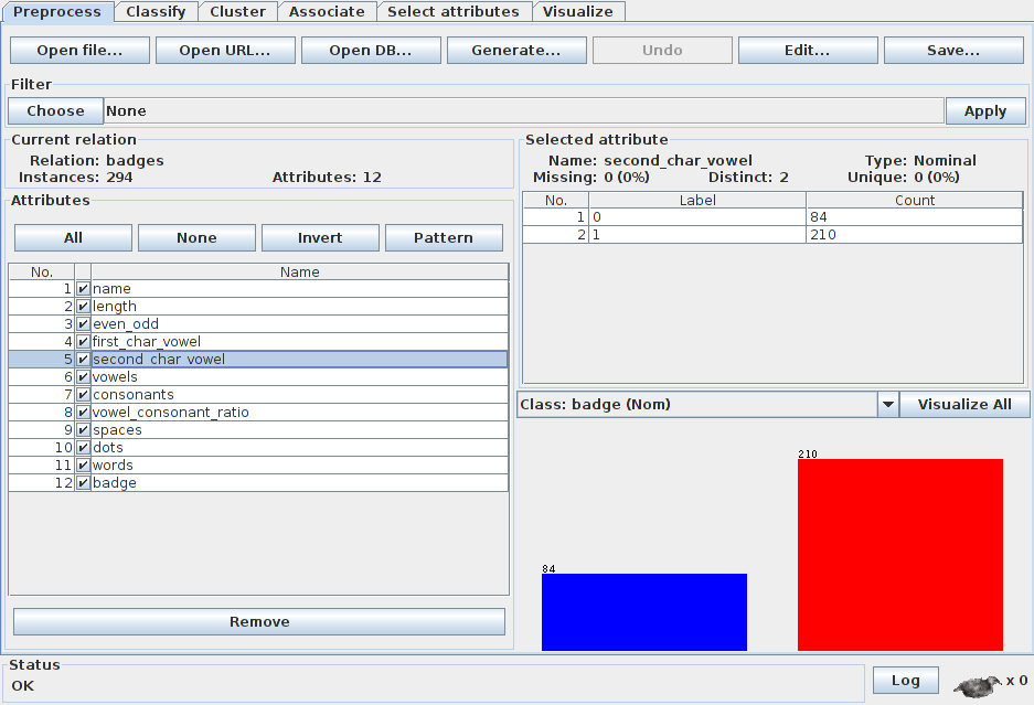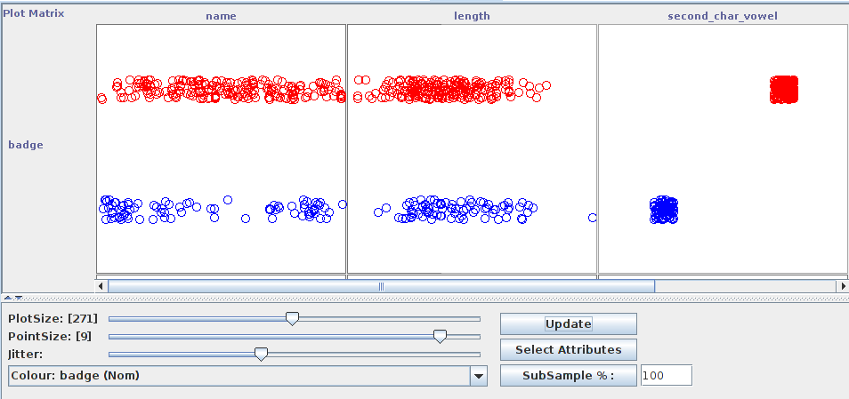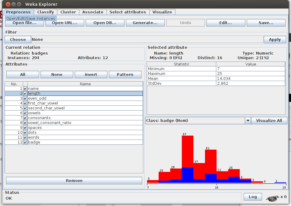 Le graphique affiché représente en abscisse la longueur des noms, et en ordonnées le nombre de badges correspondant. La classification est logiquement faites sur les badges (+ ou -) et est représentée par les couleurs rouge et bleu.