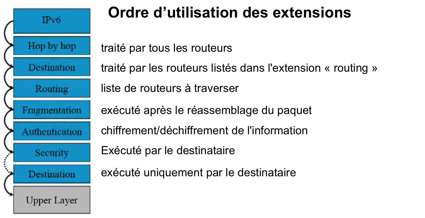 Il est possible qu'un ou plusieurs en-têtes d'extension suivent l'en-tête IPv6. Voici sur l'image ci-dessous l'ordre d'utilisation des extensions :