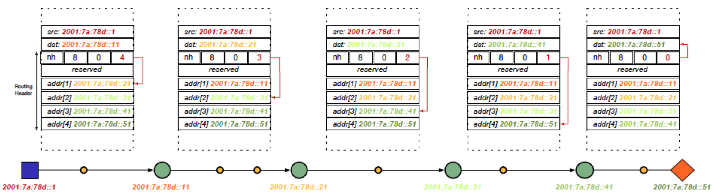 Fonctionnement : Le champ destination dans l'entête IPv6 contient l'adresse du premier relais. Lorsque le premier relais est atteint, il remplace l'adresse de destination par l'adresse du prochain relais et son adresse est retirée de la liste des relais à traverser.