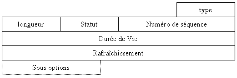 - Rafraîchissement : indique au nœud mobile la fréquence d’envoi de BU vers cette destination.