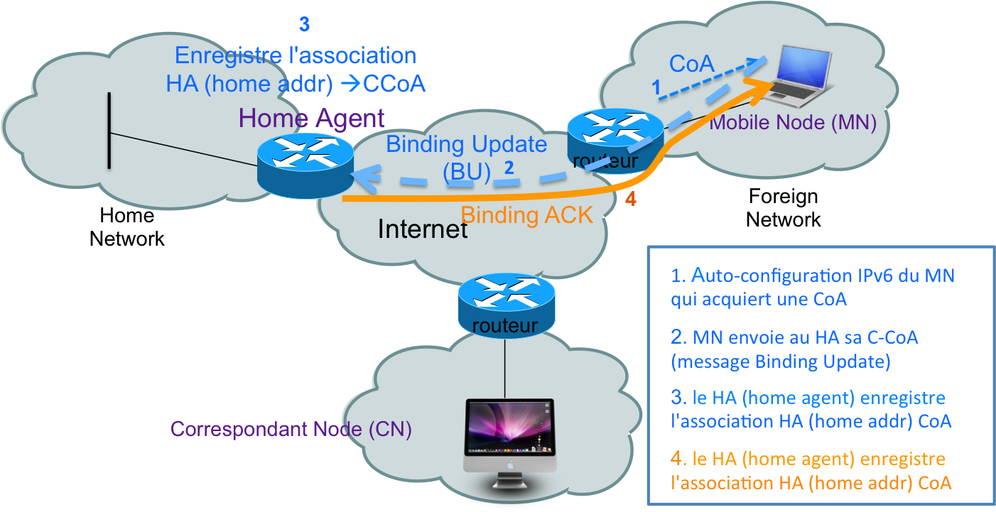 Dès qu’un nœud détecte qu’il est désormais dans un nouveau réseau, il fait appel à ICMPv6 qui procède à l’auto configuration d’une nouvelle adresse IP. Cette nouvelle adresse est l’adresse de care-of du nœud.