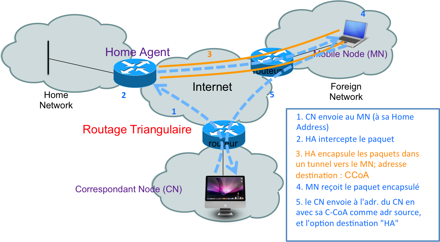 - Le routage se fait en utilisant une adresse topologiquement correcte : care-of-address (CoA)