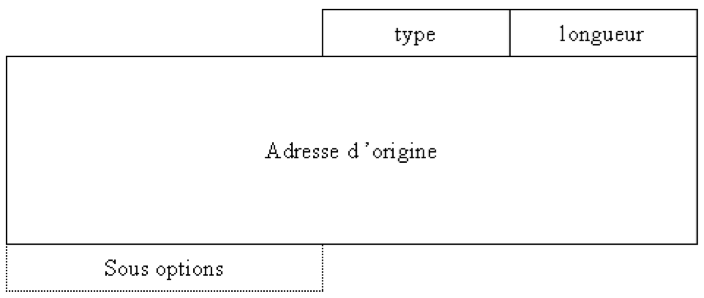 Cette option est incluse dans un paquet envoyé par un nœud mobile lorsqu’il est hors son réseau d’origine afin d’informer la destination de son adresse d’origine. En fait un nœud mobile utilise comme adresse source dans ses paquets une de ses adresses de care-of-address. Ainsi le nœud destinataire est capable de substituer l’adresse de care-of-address par l’adresse d’origine et rendre ainsi la mobilité transparente aux couches supérieures.