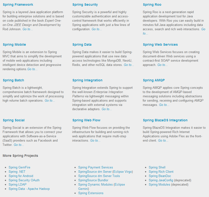 Spring Source dispose à ce jour de nombreux projets. Chacun opère dans divers domaines comme la gestion d'une couche sécurité avec Spring Security, la fabrication d'une application web en quelques cliques avec Spring ROO (présentation dans le chapitre concerné) ou encore la possibilité de faire de la version mobile avec Spring Mobile et bien d'autres encore.